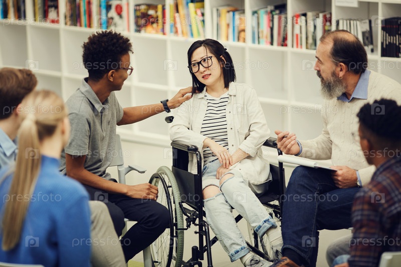 Группа молодых людей и психотерапевт сидят в кругу и оказывают поддержку женщине на инвалидном кресле во время психологической сессии