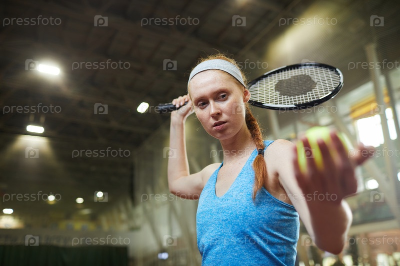 Серьезно сосредоточенная профессиональная теннисистка в синей рубашке и головной повязке, стоящая на крытом поле и подающая мяч во время начала матча