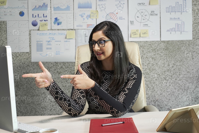 Бизнес-леди, указывающая на экран