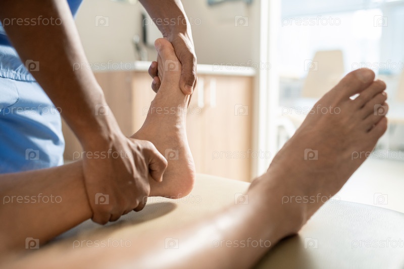Руки молодого медицинского специалиста смешанной расы, массирующего одну из ног пациента