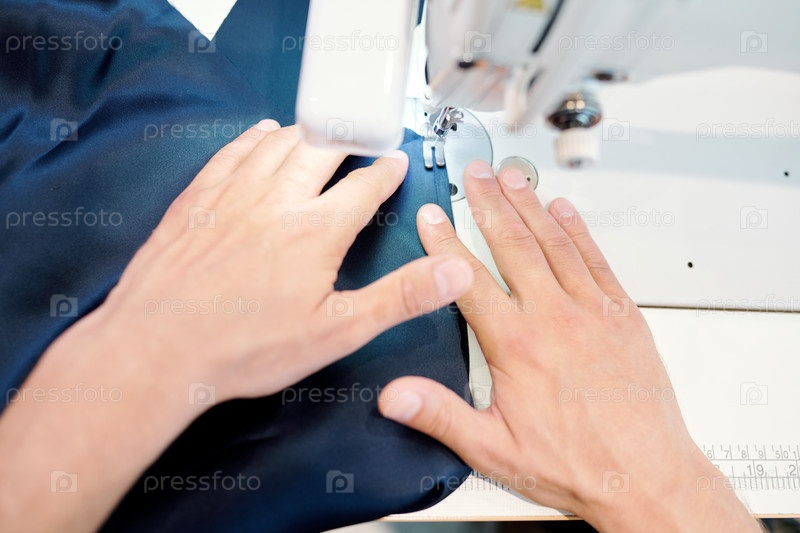 Человеческие руки, держащие темно-синий ткань во время пошива машиной