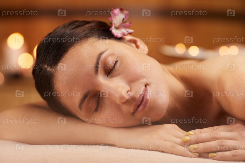 Спокойная молодая брюнетка-женщина с цветом в волосах, держащая глаза закрытыми, лежа на массажном столе