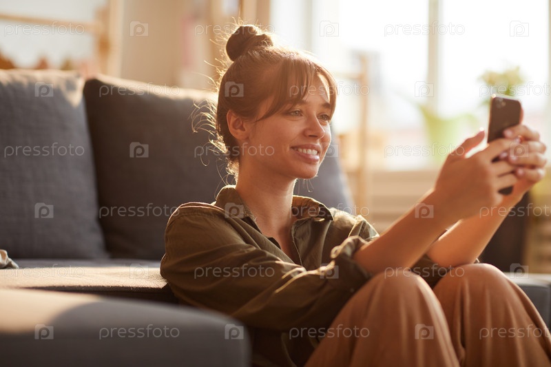 Улыбающаяся красивая девушка с брюнетками, опираясь на диван и просматривающая Интернет на смартфоне во время поиска информации