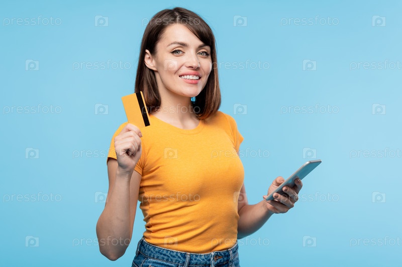 Довольно молодой клиент с банковской картой и смартфоном делает онлайн-заказ