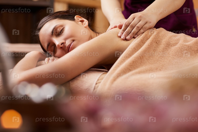 Удовлетворенная молодая женщина с коричневыми волосами лежала со закрытыми глазами на массажном столе, в то время как профессиональный массажист намазывал ей спину