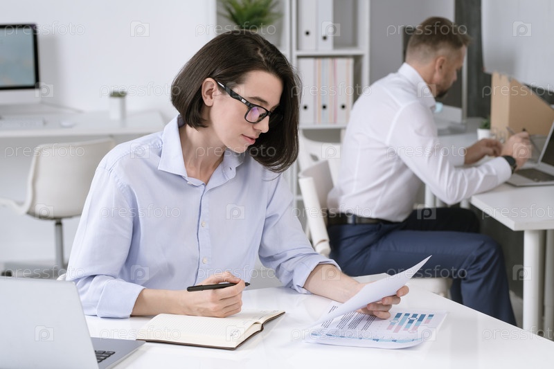 Загруженная руководительница офиса просматривает бумаги и делает заметки у стола