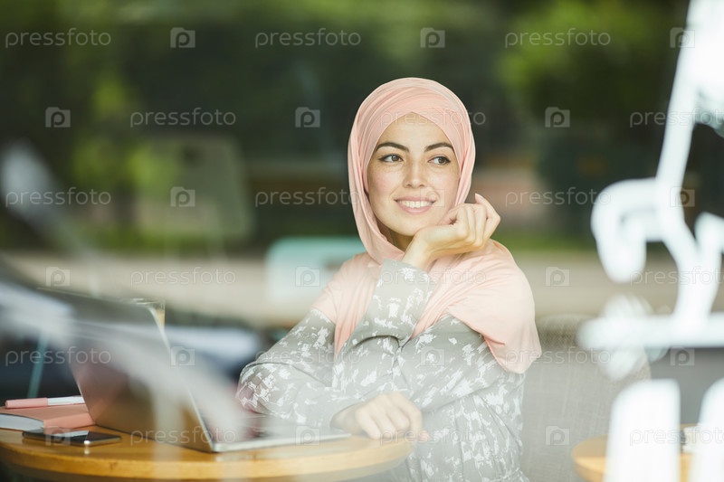 Мусульманка, сидящая за столом в кафе