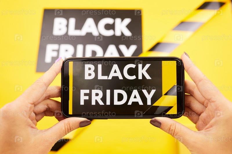 Близкий снимок неузнаваемой женщины, использующей смартфон и размещающей рекламу Черной пятницы в социальных сетях
