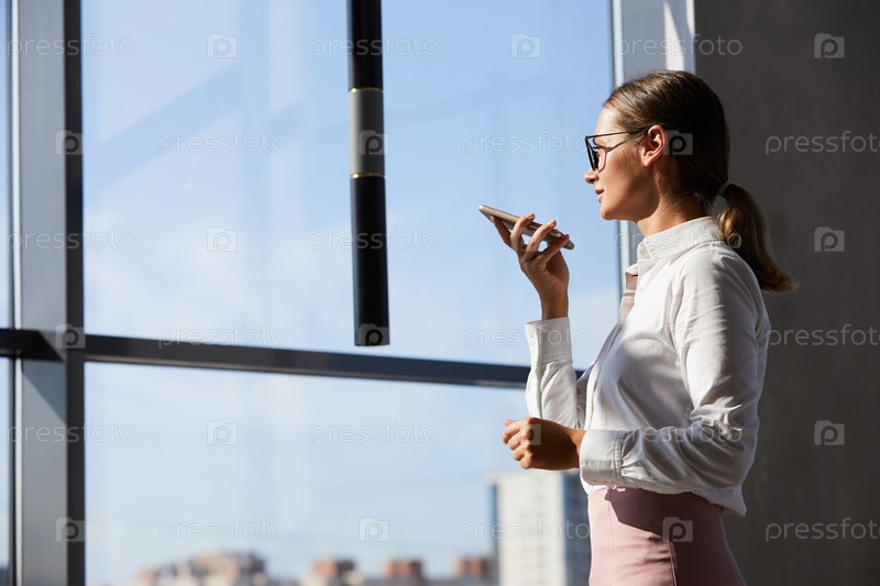 Уверенная в себе молодая деловая женщина с конским хвостом стоит у окна и отправляет голосовое сообщение коллеге