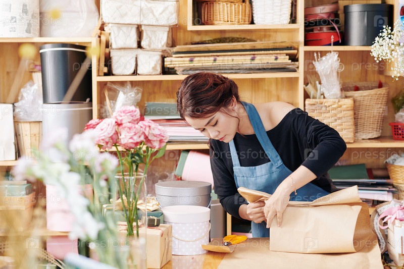 Женщина упаковывает подарок на день рождения