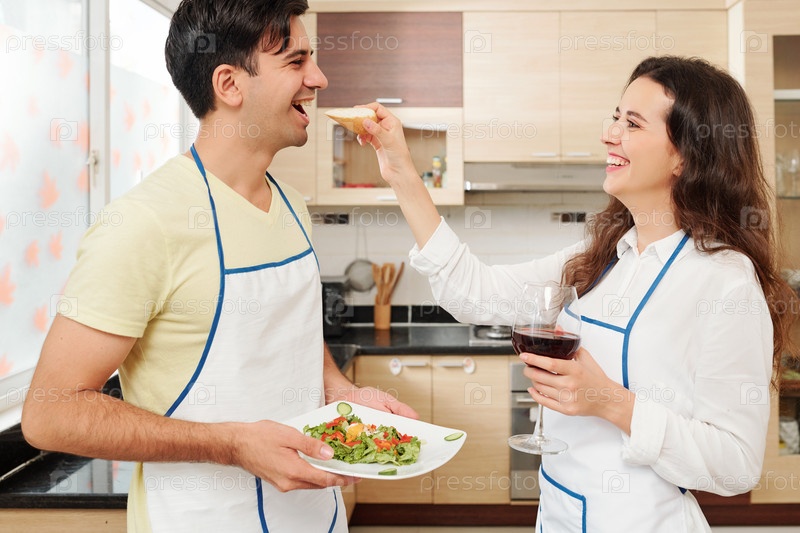 Женщина делится куском хлеба с мужем