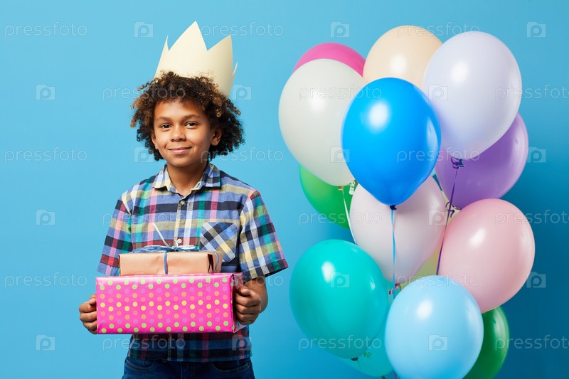 Веселый мальчик с днём рождения позирует на синем