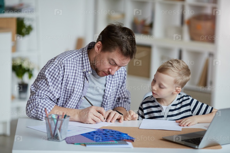 Серьезный молодой отец сидит за столом со своим сыном и рисует на бумаге, помогая ему с домашними заданиями