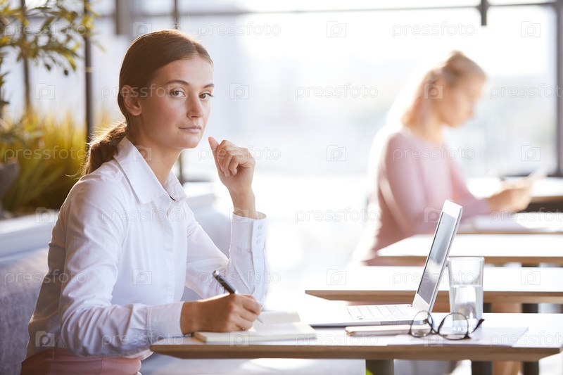Портрет серьезной привлекательной молодой бизнес-леди в формальной блузке, сидящей за столом в кафе и готовящейся к ежегодной встрече