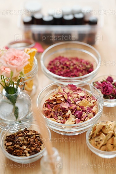 Стеклянная посуда с сухими ароматическими ингредиентами, специями и ломтиками груши на деревянном столе