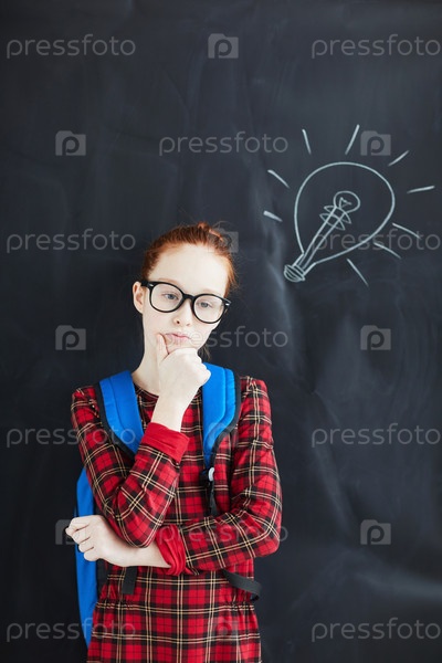 Вдумчивая сосредоточенная школьница в очках, одетая в квадратное платье, стоит на доске с лампочкой и размышляет над идеей