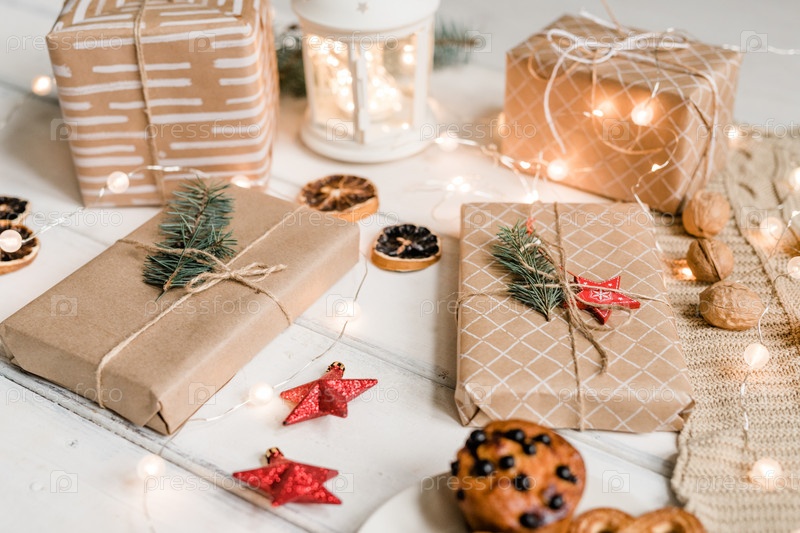 Подарки упакованы среди декоративных красных звезд, грецких орехов, сверкающих гирлянд на столе