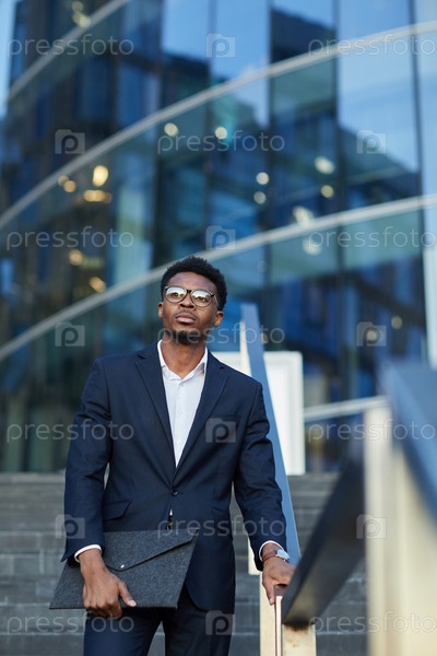 Серьезный амбициозный молодой афроамериканский бизнесмен в очках спускается по лестнице и размышляет над городским пейзажем
