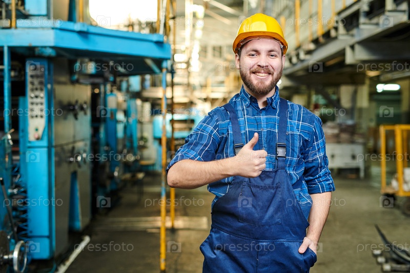 Веселый, взволнованный красивый молодой промышленный рабочий с жесткой шляпой стоял на фабрике и показывал большой палец, глядя в камеру