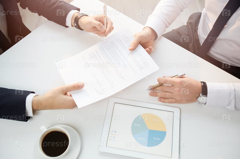 Вид сверху неузнаваемого бизнес-менеджера, сидящего за столом с чашечкой кофе и планшетом и подписывающего контракт с представителем партнерства на деловой встрече