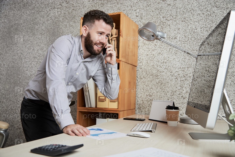 Бизнесмен обсуждает работу по телефону