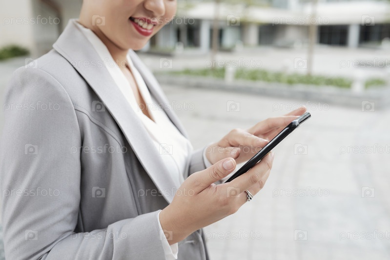 Деловая женщина, использующая мобильный телефон на открытом воздухе