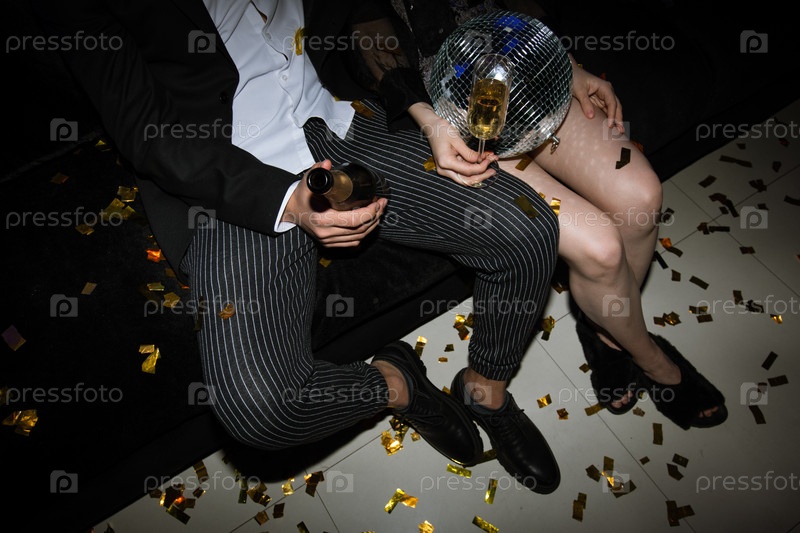 Ноги молодой пары, приносящей тост за флейты шампанского, отдыхая на диване