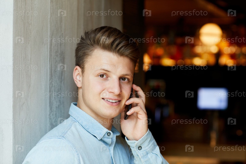 Портрет контента Красивый молодой человек с модной прической, одетый в рубашку стоит у стены и звонит бизнес-консультанту по телефону