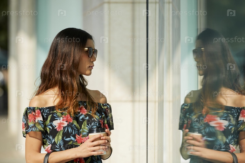 Молодая женщина на витрине магазина