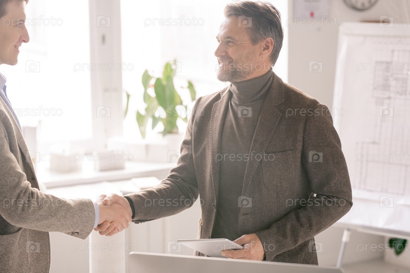 Счастливый зрелый инженер с сенсорным панелем приветствует нового делового партнера рукопожатием