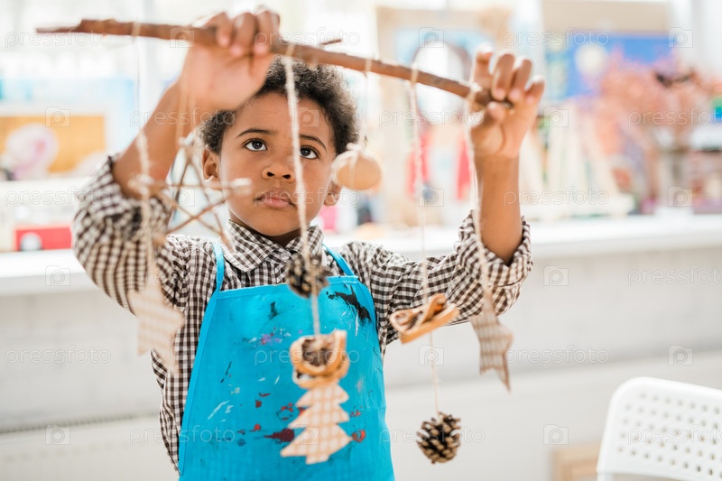 Милый серьезный школьник в синем фартуке смотрит на палку с ручными рождественскими игрушками xmas