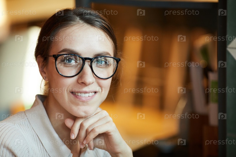 Позитивная молодая красивая леди с доброй улыбкой, одетая в стильные очки, опирающаяся головой на руку и смотрящая в камеру