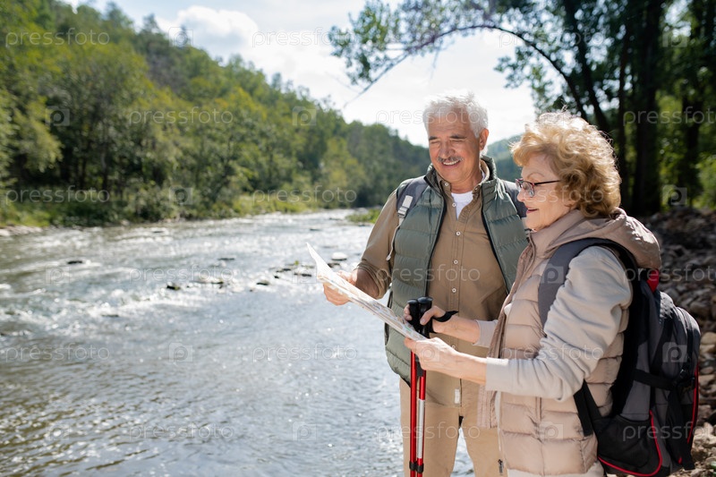 Активная старшая пара с рюкзаками смотрит на карту, стоя у большой реки