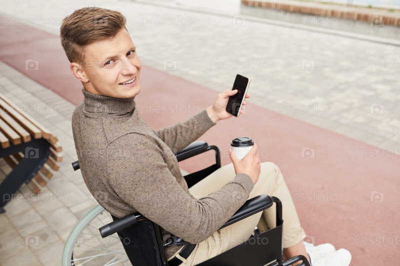 Портрет веселого красавчика-инвалида в коричневом гардеробе, сидящего на инвалидной коляске снаружи и использующего смартфон во время питья кофе
