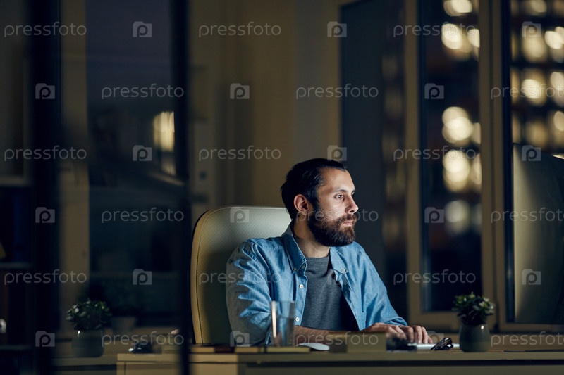 Серьезно сконцентрированный молодой бородатый мужчина в обычной рубашке сидит за столом в темном офисе и использует компьютер, получая веб-дизайн до крайнего срока