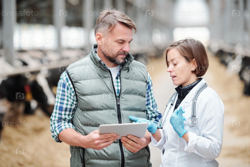 Молодой ветеринар показывает или объясняет онлайн-данные работнику фермы