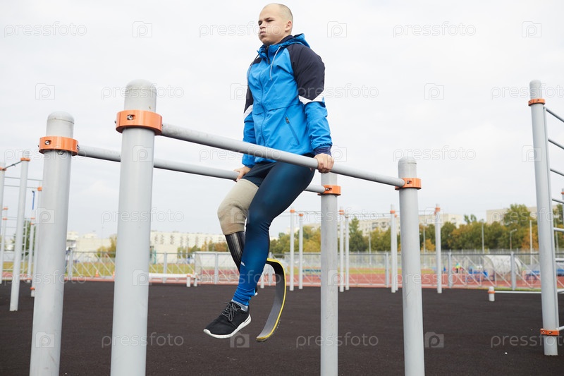 Серьезный выносливый молодой инвалид с бегущим лезвием, висящий на параллельных решетках во время тренировок на спортивной площадке