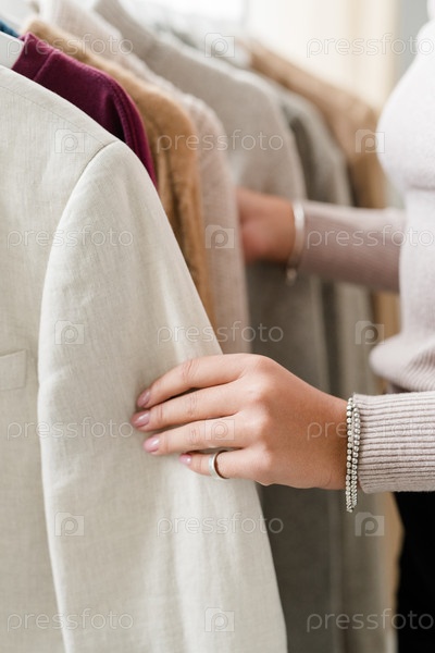 Рука молодой женщины, держащей за рукав куртку из новой сезонной коллекции