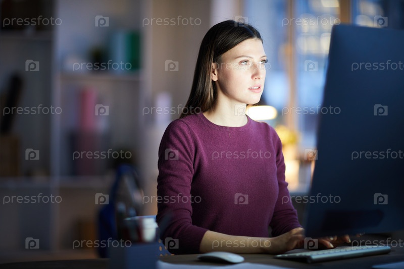 Вдумчивый сконцентрированный графический дизайнер в свитере сидит за столом и печатает на клавиатуре компьютера, работая над проектом в темном офисе