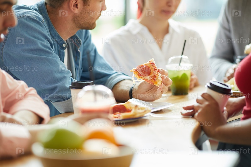 Близкий план молодых друзей в повседневной одежде, сидящих за столом и едят пиццу вместе, проводя свободное время в кафе