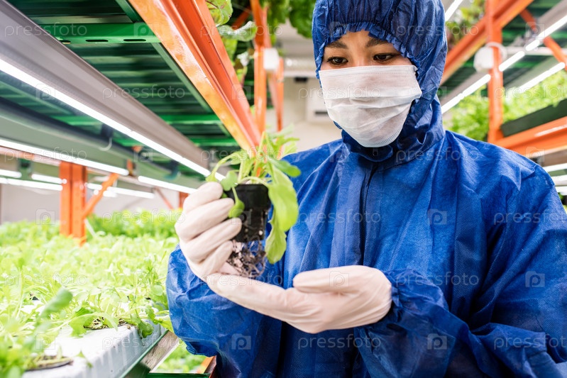Молодой исследователь азиатской этнической принадлежности держит маленький горшок с зеленым саженцем
