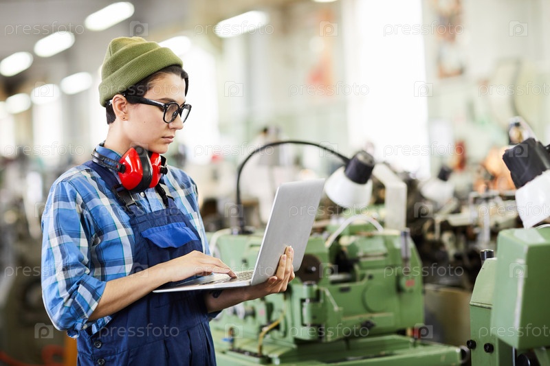 Серьезная женщина-инженер в общей сложности стоит в фабричном магазине и изучает онлайн эскиз на ноутбуке