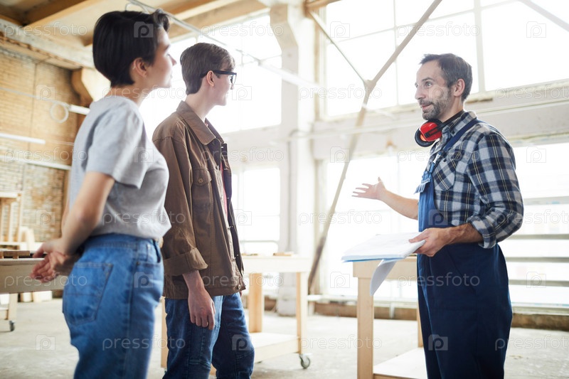 Строитель, представляющий проект дома заказчикам