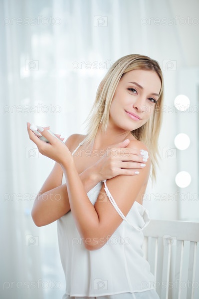 Улыбающаяся женщина наносит увлажняющий лосьон для тела
