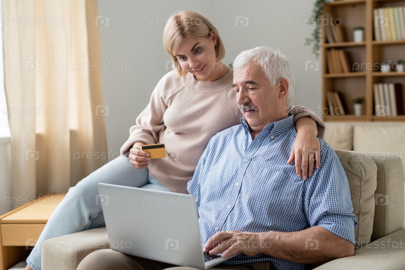 Молодая женщина с кредитной картой и ее старший отец с ноутбуком покупают онлайн
