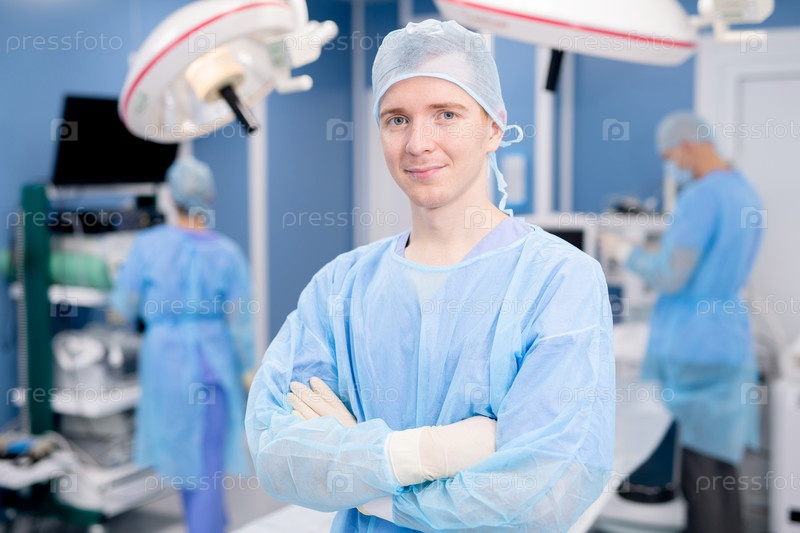 Успешный профессионал в форме хирурга, скрестив руки на груди