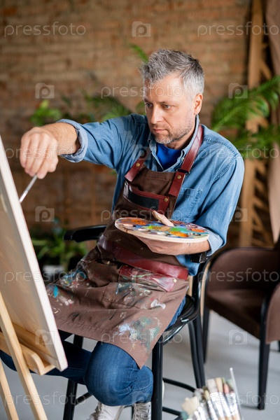 Концентрированный профессиональный художник с палитрой, работающий над новой картиной