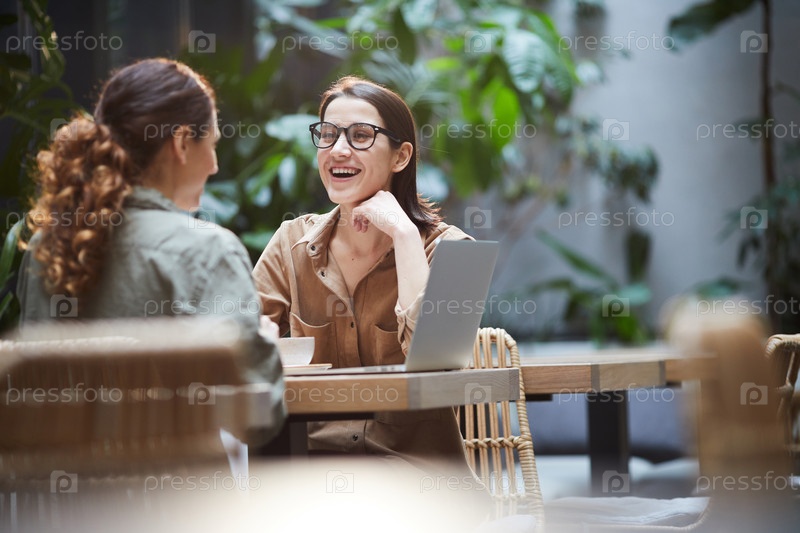 Женщина смеется во время обеда с коллегой