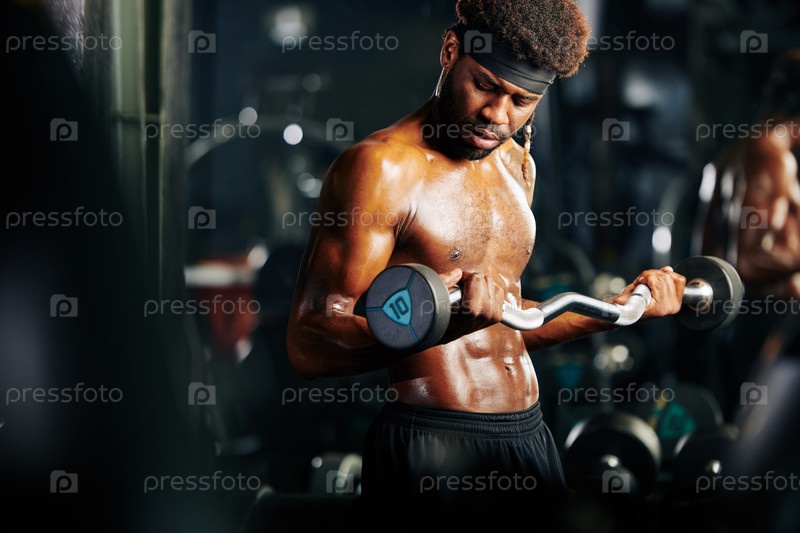 Спортсмен занимается с помощью EZ curl bar