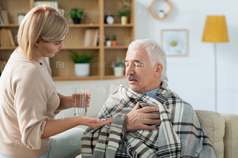 Больной пожилой человек и его заботливая дочь, приносящая ему стакан воды и таблетки
